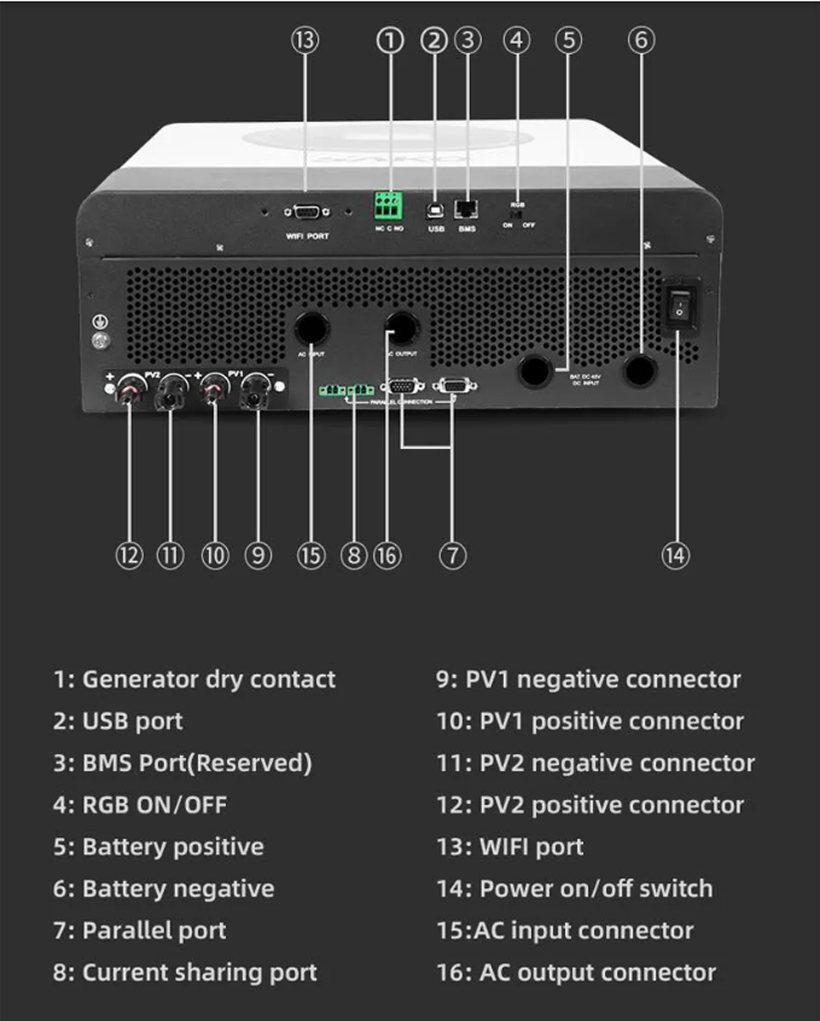 3.Dual MPPT tracker inside (2pcs*18A), max PV input 8000W